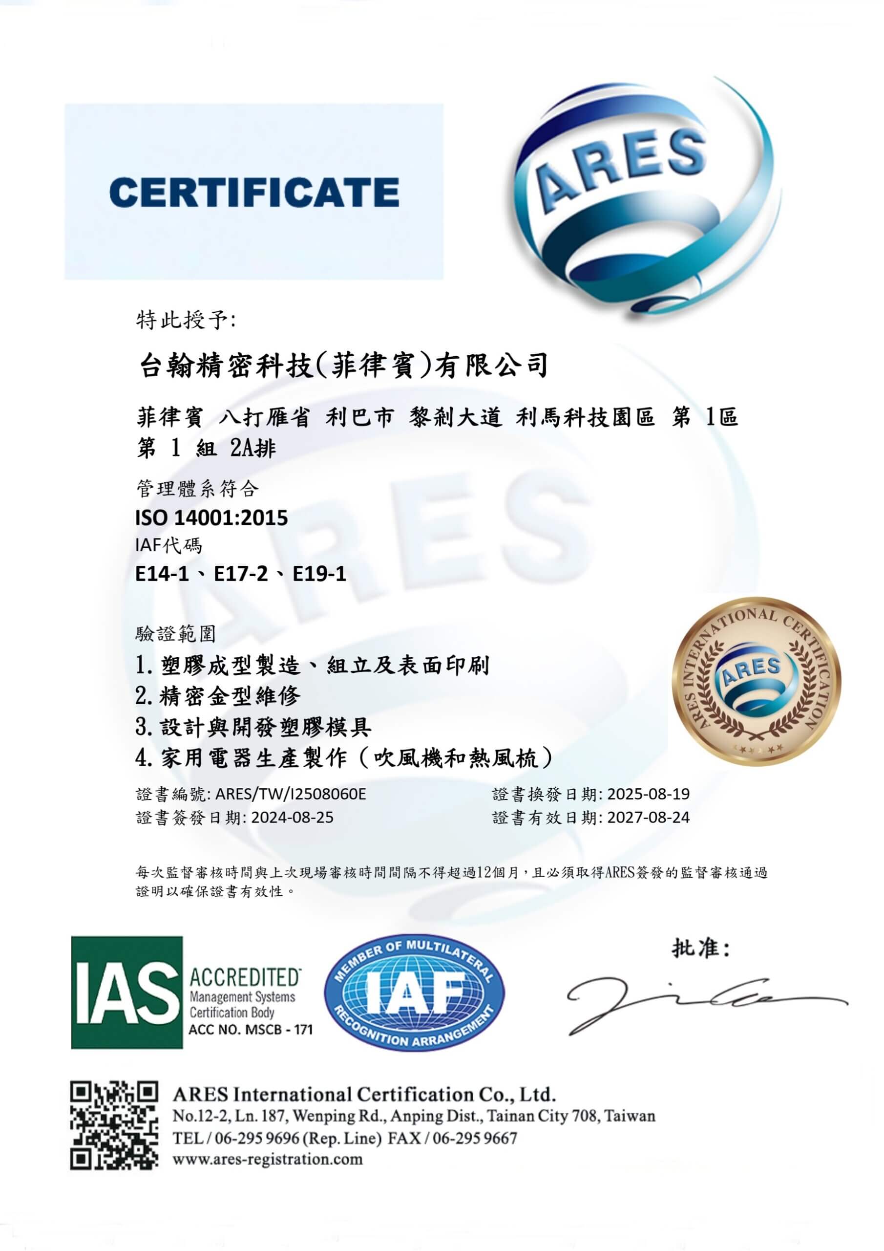菲律賓曾孫公司Taihan Precision Technology (Philippines) CO., INC.登記成為PEZA經濟特區加工出口企業,並享有特區相關租稅優惠