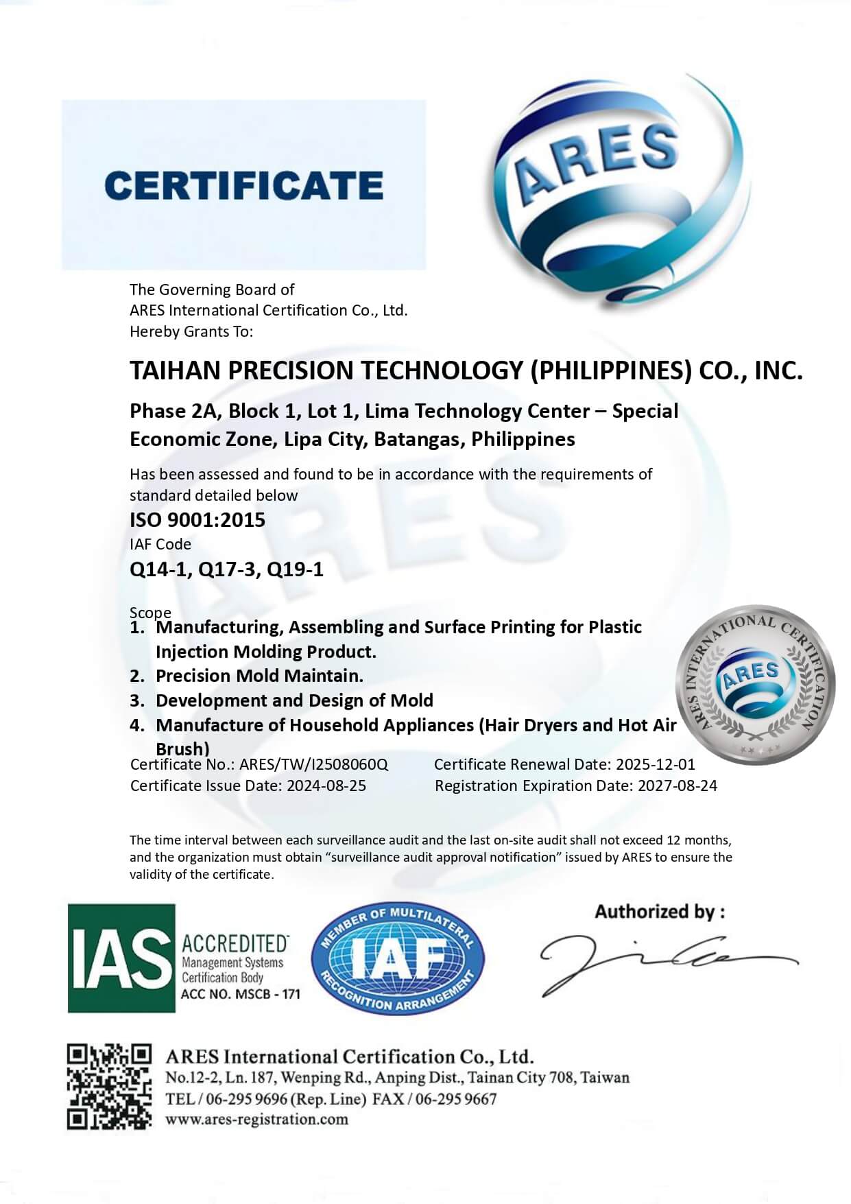 TaiHan Land (Philippines) Inc. registered as Philippines Economic Zone Authority (PEZA) special economic zone enterprise with relevant rental tax benefits.